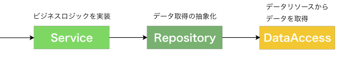 例えば、前述したようなAPIを用いたクライアント側の実装で、「APIを叩いて、データを取得する処理を実装したい」場合DataAccess層に、「取得したデータを加工して必要なデータだけ抽出する」などのビジネスロジックはService層に実装する。と下の図のように定義されています。
