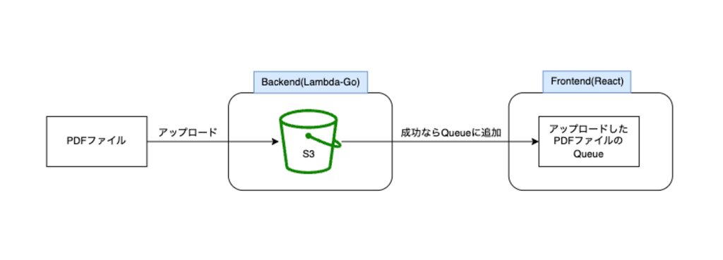 PDFファイルのアップロードが成功だったら、それらをフロントエンド側Queueに保存しておきます。