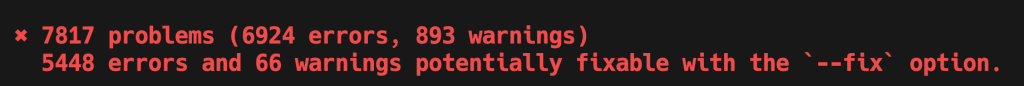 最初にXOをインストールし、1つのプロジェクトで実行してみると、fixableなerror, warningも含め7817個のエラーが出ました。