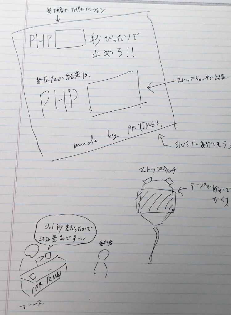 PHPになるべく関係のあるゲームにしたかったので、チーム内でもすぐにその案の方向で制作することに決まりました。ブース企画担当であった私と土屋さんで企画の作成を進め、uzullaさんのレビューと合わせながら**「PHP8.3秒チャレンジ」**というブース企画となりました。