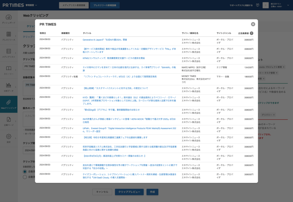 PR TIMES Webクリッピング(以降Webクリッピング)とは様々なサイトから記事をクロールし、その記事にユーザーが設定したキーワードが含まれていればクリップしたりなど、メディア露出の調査・分析などが可能なWebアプリケーションです。