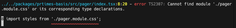このエラーは別パッケージのtsconfigで設定されているrootDirsの設定を読み込めず、CSS Modulesの型定義が見つからないため、発生しています。今回の場合、利用する側のパッケージにとっては別パッケージのtype errorは関係ないため(そのパッケージ内でtypecheckが保証されていれば)、利用する側のパッケージにCSS Modulesの型定義を追加し、エラーを抑えました。