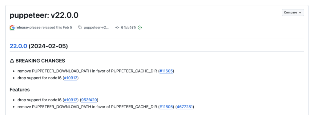 インターネットで調べてみて、Puppeteerのバージョン22以降では大きな変更があるとわかりました。