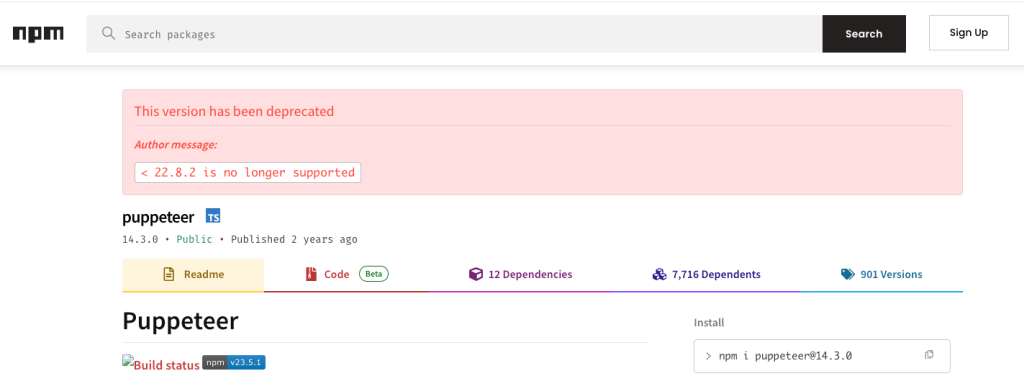 Puppeteerの最新バージョンを使いたいです。しかし、Puppeteerのリリースノートによると、バージョン22以降はNode.js 16のサポートが終了しています。そのため、Puppeteerの最新バージョンを使用するために、まずNode.jsをバージョンアップする必要があります。