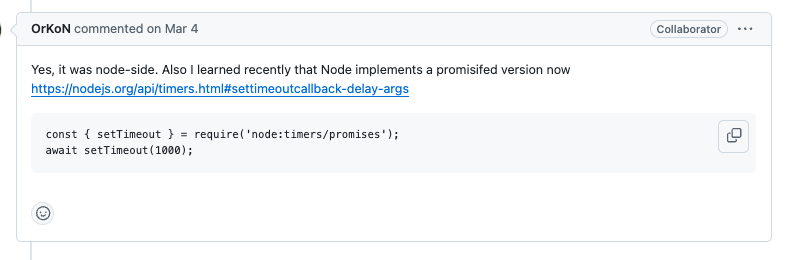 Puppeteerの開発者たちは、waitForTimeoutを使用する代わりにwaitForSelectorやwaitForなどの代替案を提案していますが、現時点での技術的要件から、すぐにこの関数の使用を中止することはできません。システムの現行仕様を変えずにwaitForTimeout関数の代替策を見つける必要があります。幸運なことに、Puppeteer v22のリリースノートのコメントセクションで、開発者の一人であるOrKoNさんが代替策を提供しています。