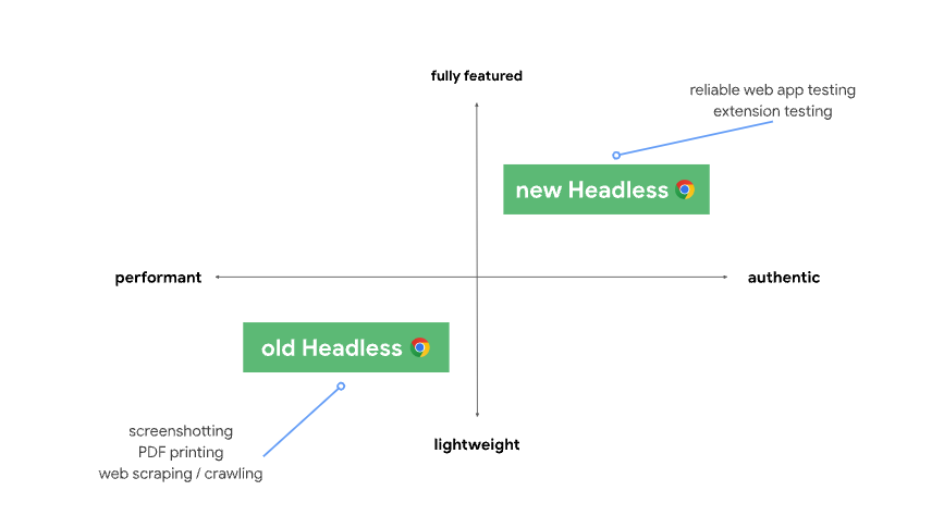 以下の図を見ると、旧ヘッドレスモードは軽量で、パフォーマンスが優れており、クローリングやウェブスクレイピングなどのタスクに適していることがわかります。