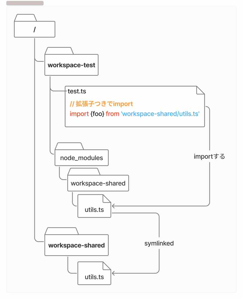 import {foo} from 'workspace-shared/utils'; // エラーになるError: Directory import '/workspace-test/node_modules/workspace-shared/utils' is not supported resolving ES modules imported from /workspace-test/test.tsこれはimportされる側のpackage.jsonにexports フィールドを指定することで回避できますが、exportsでBarrel Fileをエントリポイントに指定する必要がありデメリットも大きいので、今回は採用しませんでした。