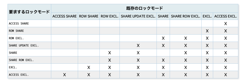 このロックはUPDATE/DELETE、INSERT、SELECTも競合しないロックレベルです。基本的にはユーザー操作に影響が出ないということです。ロックについては以下の表で見ると分かりやすくて、競合するロックが減っていることが分かります。